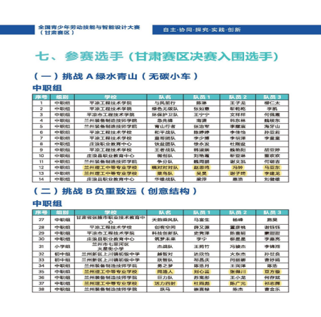 近日,由甘肃省职业教育校企合作促进会、甘肃中华职业教育社主办,兰州资源环境职业技术大学承办,读者出版集团、甘肃省教育装备行业协会协办的2023-2024学年全国青少年劳动技能与智能设计大赛(甘肃赛区)选拔赛在兰州资源环境职业技术大学顺利落下帷幕。本次大赛吸引了来自全省6个地州市32所职业院校的123支队伍共计401名选手参加了比赛。经过为期两天的激烈角逐,在无碳小车赛项中,理工学院(理工中专)李栋梁老师指导,吴昊、谢子琦、李建龙同学组成的菜鸟队获一等奖,赵思鸣、冯钟、马亚东、马鸿宇同学组成的咦对对对队获得二等奖。在创意结构赛项中,李栋梁老师指导,刘心芸、张得川、豆方旋同学组成的同路人队获得三等奖;李生泉老师指导,杜雨彪、陈广元、祁志辉同学组成的活力四射队获得三等奖。学校获得“十佳组织奖”。