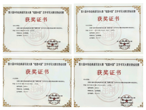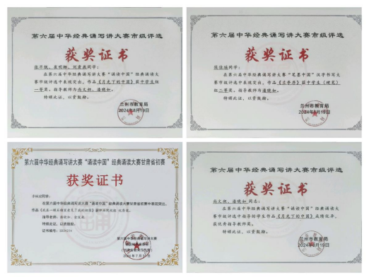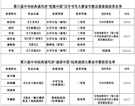 本次大赛中,我校师生表现突出,共获得多个奖项,并在国赛上有新的突破。其中,在“诵读中国”经典诵读大赛中,我校中职学生崔明椰、刘肃燕、张芊靓三人作品《月光下的中国》获兰州市评选一等奖,尚文昶、潘晓如老师获优秀指导教师;高职学生李铖暄声情并茂的诵读,将经典作品《我在一颗石榴里看见了我的祖国》演绎得淋漓尽致,荣获兰州现代职业学院一等奖,作品推荐至省教育厅获甘肃省职业院校组优秀奖。在“书写大赛”中,我校中职学生侯佳瑶获兰州市硬笔书法评选二等奖;高职学生李玺、薛轩获甘肃省大学生组硬笔书法比赛二等奖,按文件将二人推荐至第六届中华经典诵写讲大赛组委会后李玺同学获国赛大学生组硬笔类三等奖;此外,高职学生胡其宽获甘肃省大学生组软笔优秀奖,潘晓如老师获甘肃省教师组软笔优秀奖。