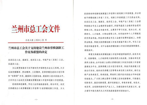 近日,兰州市总工会发布《兰州市总工会关于支持建设兰州市劳模创新工作室及联盟的决定》(兰总工办发[2024]29号),由学校工会组织申报的白彩盛劳模创新工作室顺利获批,成为兰州市唯一一个由学校牵头申报成功的劳模创新工作室。